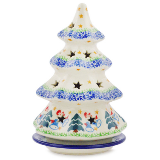 This Polish pottery stoneware Christmas tree luminary was handcrafted and handpainted by artisans from the Ceramika Artystyczna factory in Bolesławiec, Poland.